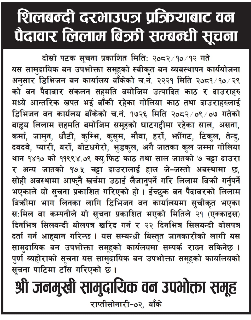 जनमुखी सामुदायिक वन उपभोक्ता समुह, राप्तीसोनारी-०२, बाँकेको गोलिया काठ/दाउरा लिलाम सम्बन्धि दोस्रो पटक प्रकाशित सुचना
