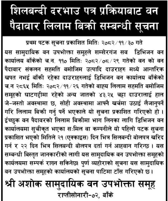 अशोक सा.व.उ.स, राप्तीसोनारी बँकेको दाउरा लिलाम सम्बन्धी सुचना ।