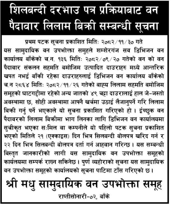 मधू सा.व.उ.स, राप्तीसोनारी-०२, बाँकेको दाउरा लिलाम सम्बन्धी सुचना ।
