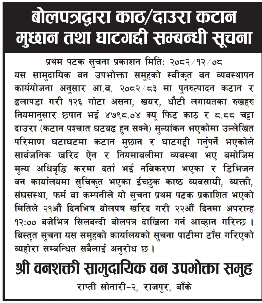 वन शक्ति सा.व.उ.स, राप्तीसोनारी-०२, बँकेको कटान मुछान सम्बन्धी सुचना ।