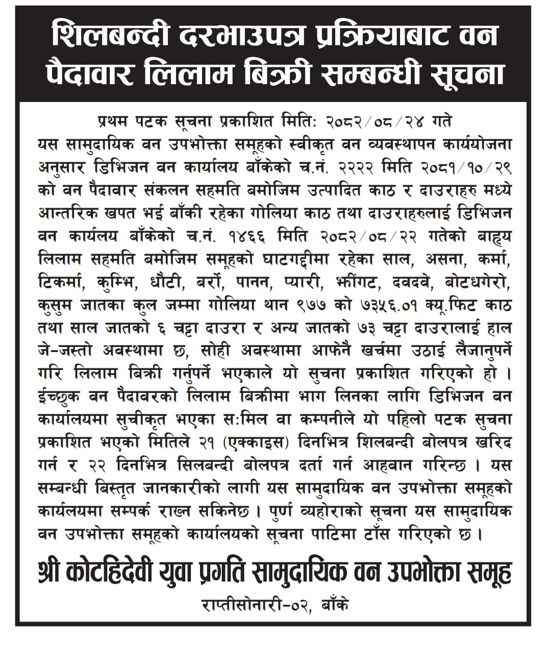 कोटहि देवी युवा प्रगति सा.व.उ.स, राप्तीसोनारी-०२, बाँकेको गोलिया काठ/दाउरा लिलाम सम्बन्धी सुचना ।