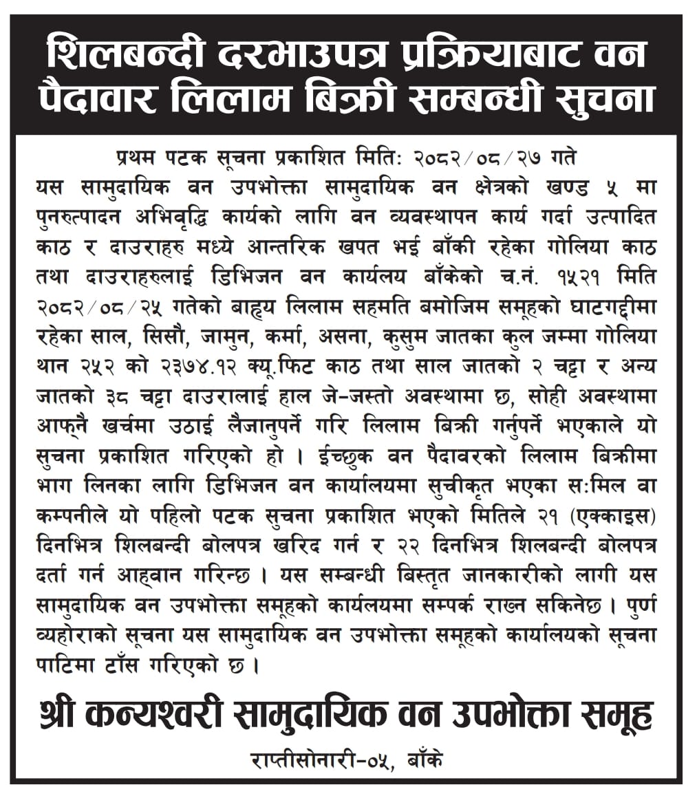 कन्यश्वरी सामुदायिक वन उपभोक्ता समूह, राप्तीसोनारी-०५, बाँकेको गोलिया काठ/दाउरा बिक्री सम्बन्धी सूचना ।