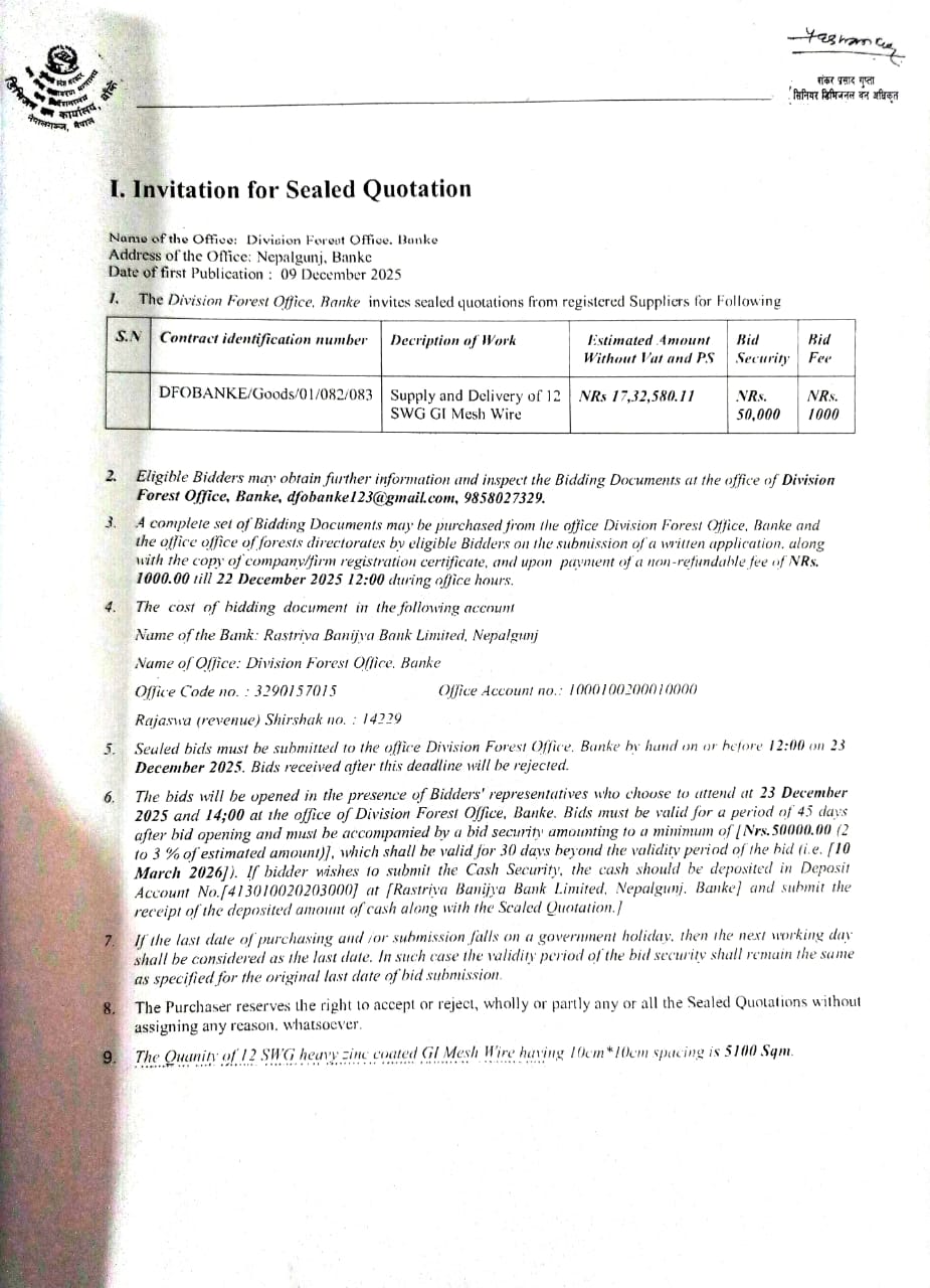 Invitation for Sealed Quotation ( Supply and delivery of 12 SWG GI Mesh Wire)
